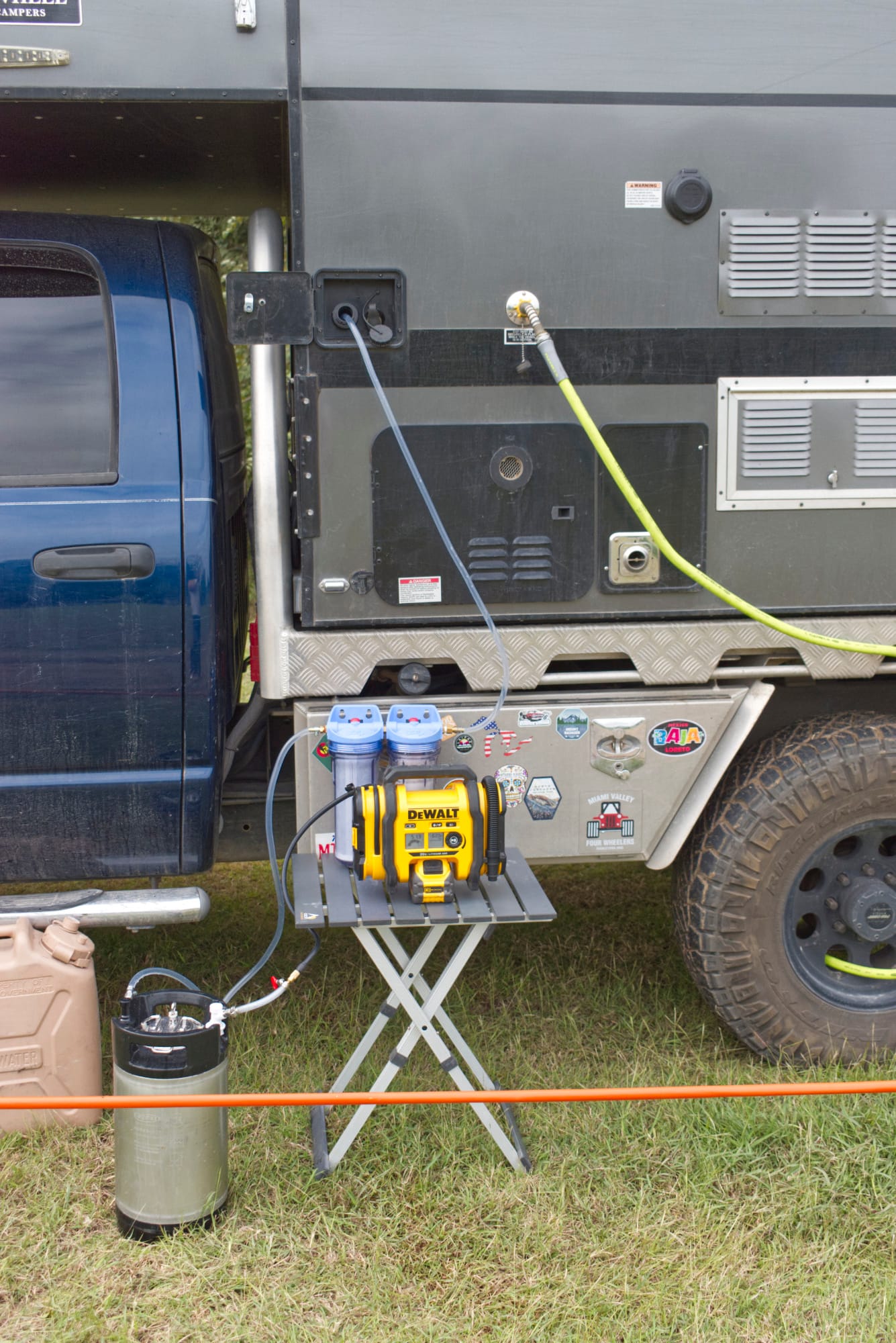 After returning to shore I hand the raft off to Heather and after a couple pics she paddles away while I tend to the water filtration system that Mark has assembled to gather water for our campers from the stream. It’s quite the setup that he has put together, using a gravity fed Sawyer to pre-filter any sediment we fill up 3gal corny kegs one at a time which are then pressurized with an air compressor to push the water first through a 5 micron carbon filter, then a .2 micron ceramic filter and finally directly into our campers fresh water tank. It is a bit of a process, hauling water from the stream 2 gallons at a time and waiting for the gravity filter to do its thing but it’s free, we have the time and most importantly we don’t have to worry about tracking down a purificada and hoping that they have a hose!