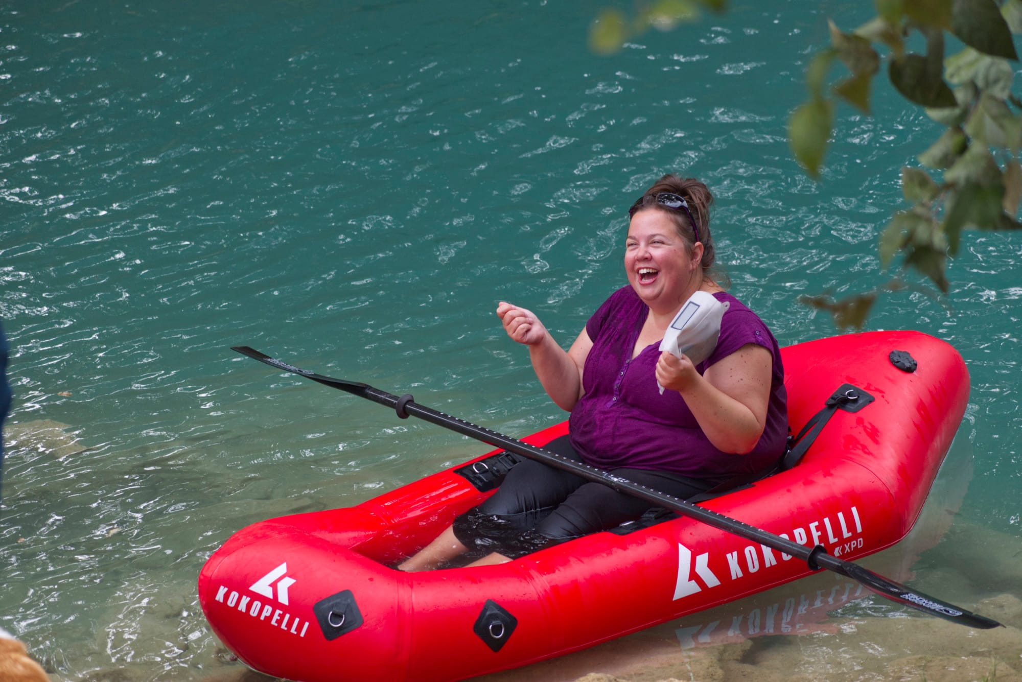 About 30 minutes after departing, Heather returns in her packraft. Completely soaked and the raft FULL of water with her phone in her mouth as she paddles. After snapping a couple of pics (and making sure that she’s ok!) I get her and the boat on shore and can’t wait to hear the story behind the flooded raft. It seems as she was taking pictures in front of a small waterfall her boat got pulled into the undertow of the fall where it proceeded to absolutely swamp both her and the raft. After I flip the raft to empty it of any excess water, undaunted by the experience she returns to the stream although I’m sure a bit more cautious this time!