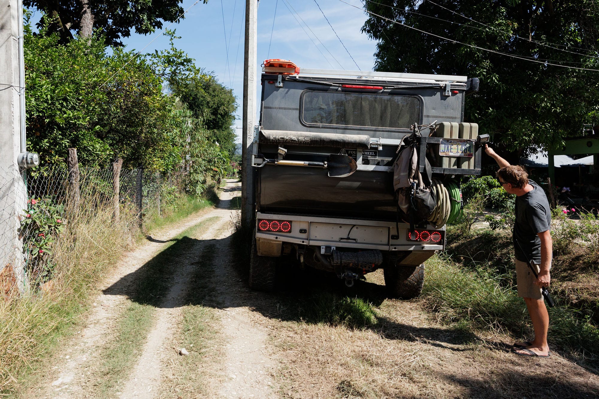 When the turn for our intended camp comes up I manage to completely miss it, fortunately a quick glance at the map shows a road ahead that circles right back to our destination, or so I thought. We make a left turn down a side street and end up in a bit of a market before turning left again down another much narrower side street that runs along a canal. As we continue down the dirt road it gets more and more narrow and we also find ourselves on the wrong side of the canal. With no way to cross other than backing up or continuing another 500 meters or so to the main road we proceed until we come to a concrete utility pole set in the middle of the road. The left side is clearly much too narrow to pass, the right side however looks like a possibility, it also looks like a possibility of rolling our home into an 8 foot deep canal. After some deliberation and with Mark’s help spotting we decide to go for it and manage to squeeze by the pole with no room to spare on the left and about a foot to the drop off on the right.