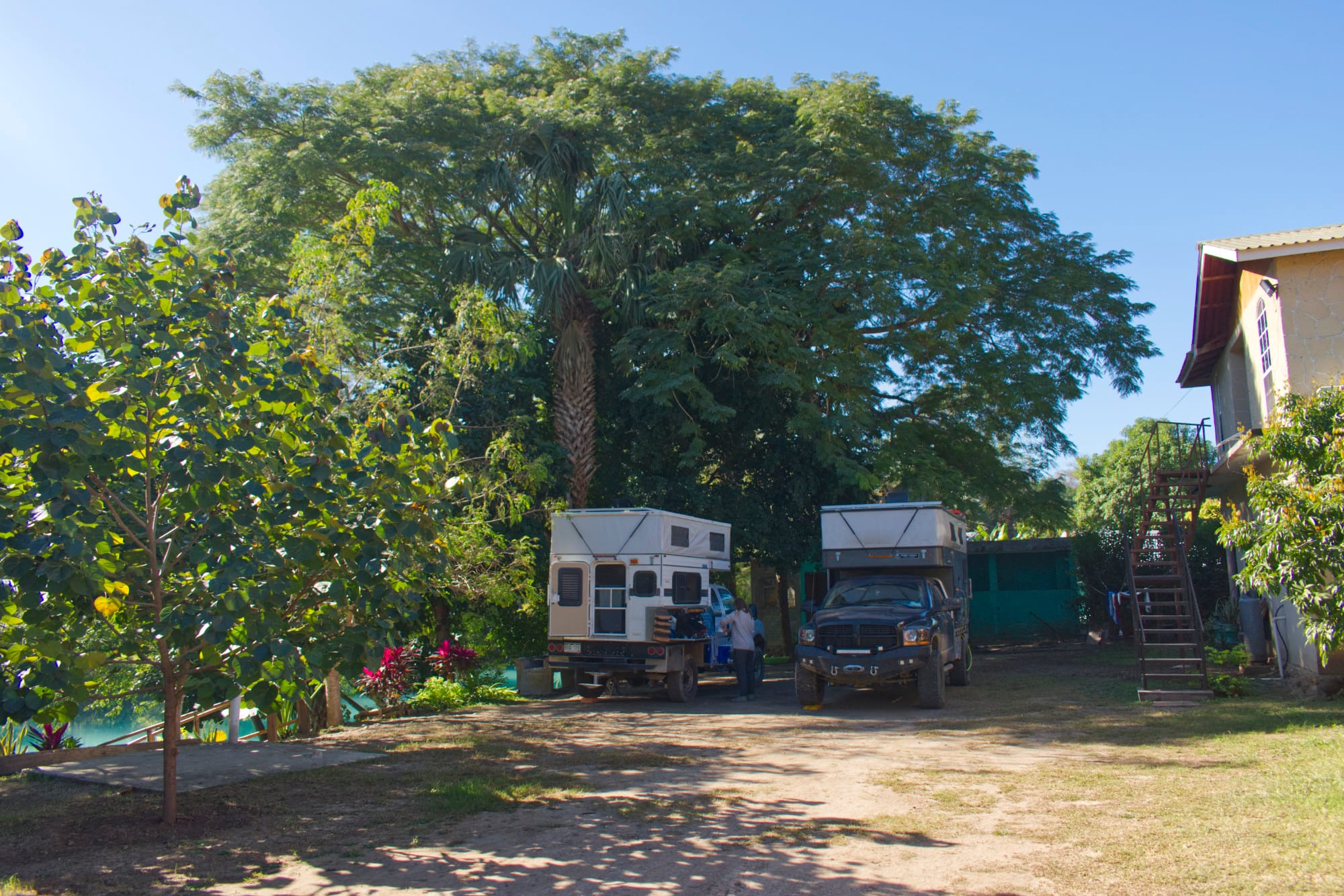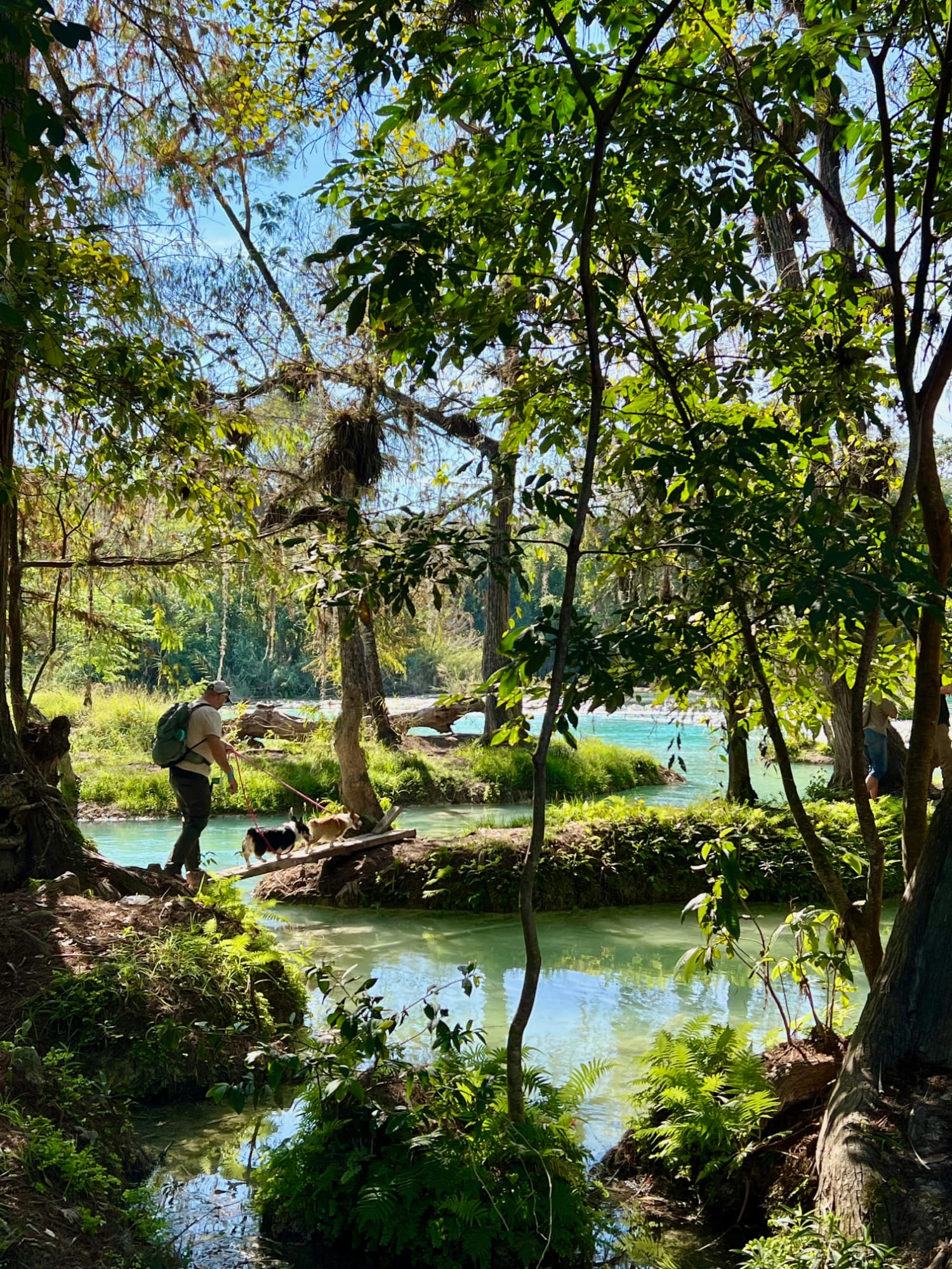 Once clear of the pole we make it out to the main road where we are able to cross to the other side of the canal and to our camp site for the night. It’s a tight fit but we make it work and we find ourselves camped just above the stunning turquoise river. It’s still quite early so after setting up we walk in to town and pay $40mx ($2us) each to check out some of the small cascades on the river. The park is full of “boardwalks” criss crossing the water to small islands in the river but they’re a bit too sketchy for Heather, the dogs however did surprisingly well on them!