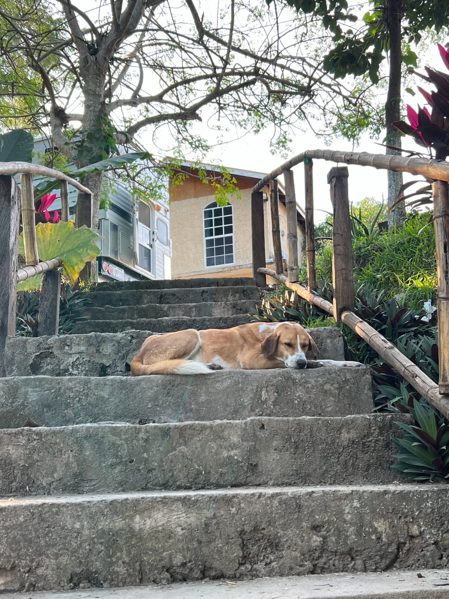 As we exit the restaurant Jake is there waiting and he accompanies us the entire way back to camp even hanging around long enough for a nap while we sit next to the river catching up on some work.