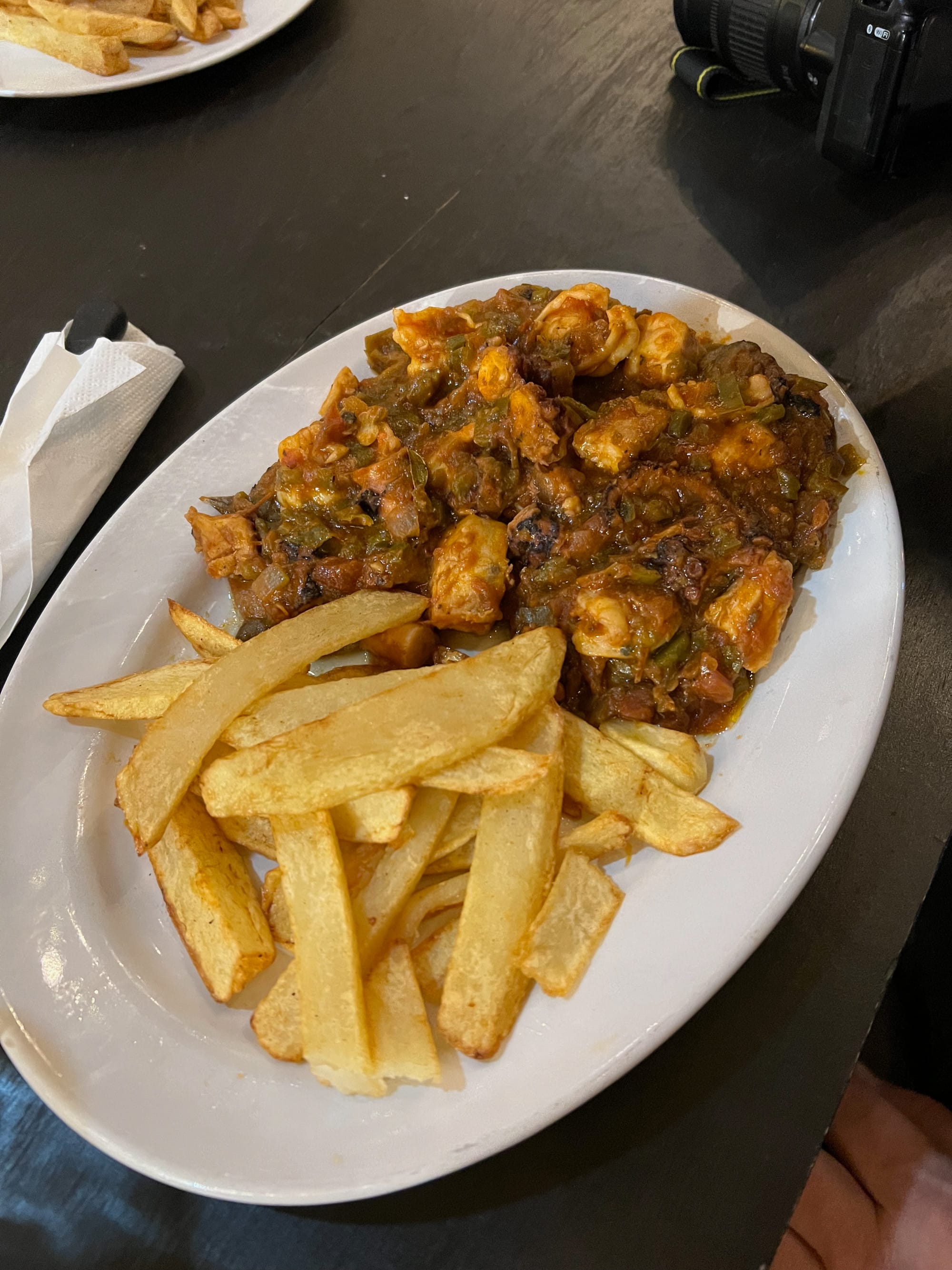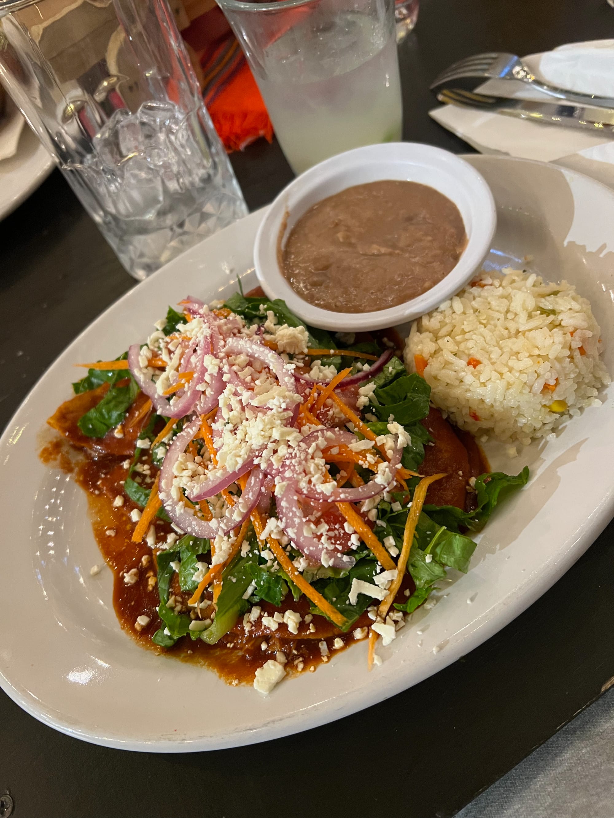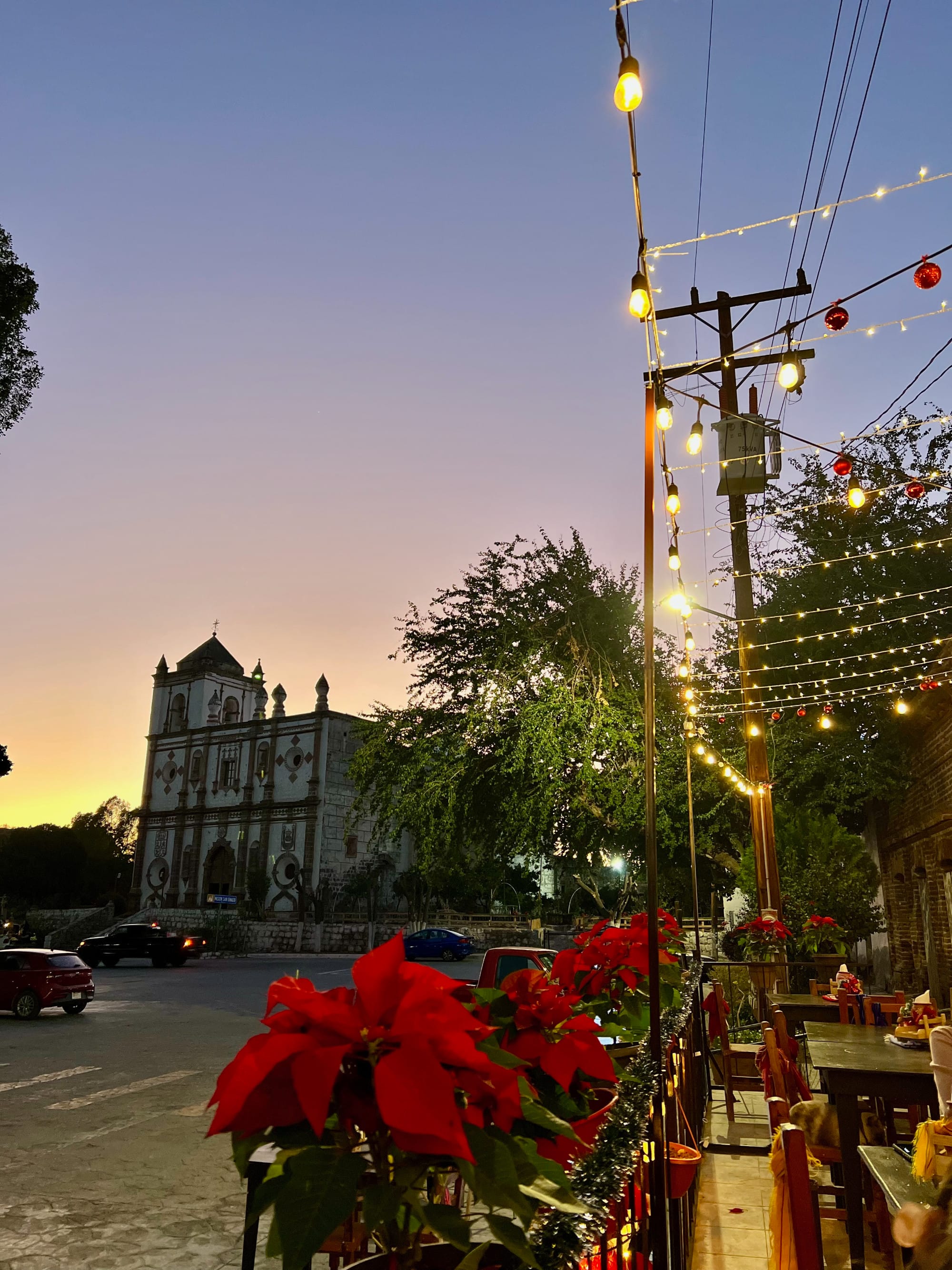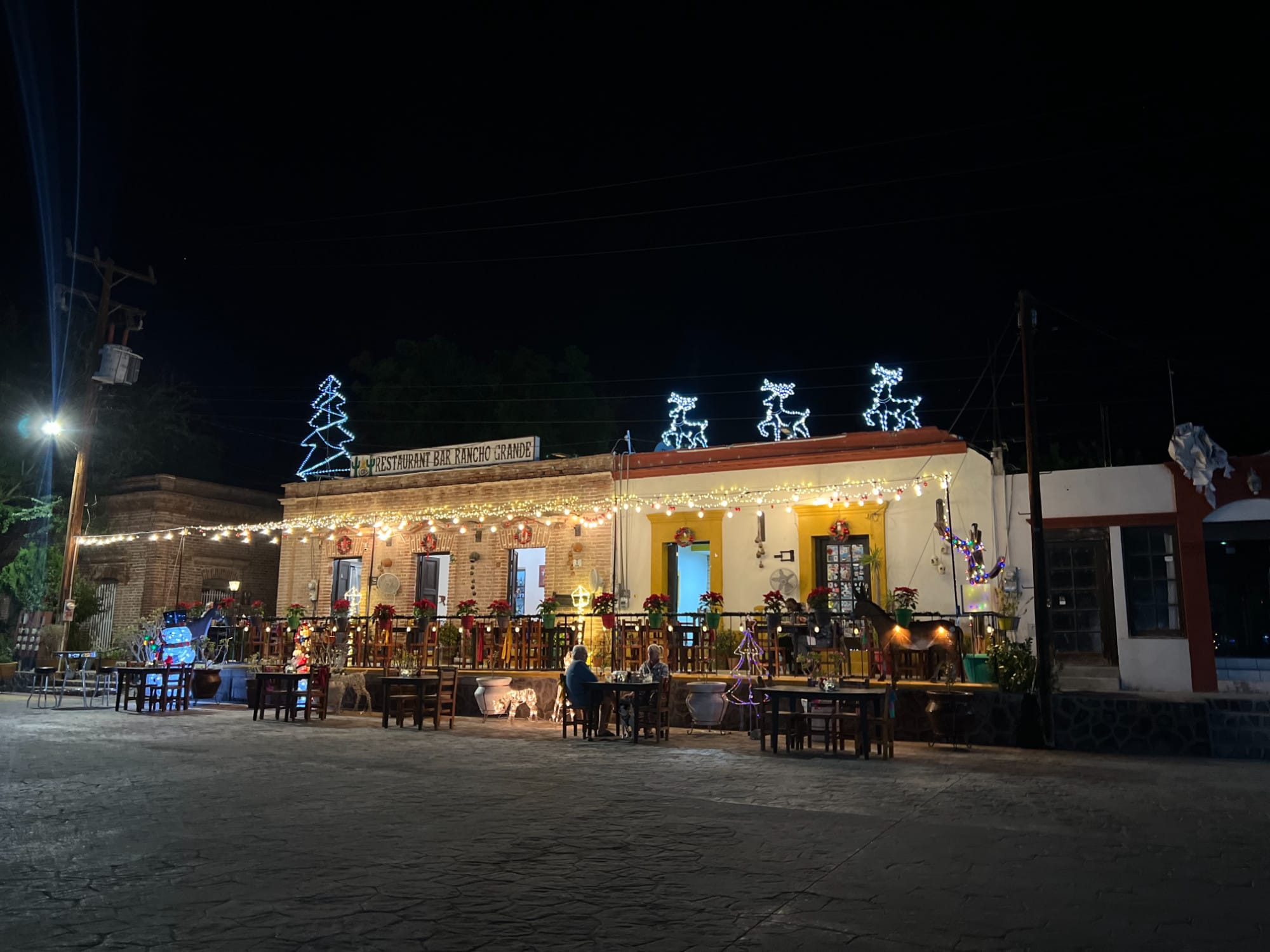 Upon completing our work for the day we cleaned up and the seven of us, plus the dogs!, made the walk to town for dinner at Rancho Grande. One of only a couple restaurants in the town square they have a beautiful patio with a view of the Spanish mission which the square is centered on. Everyone ordered the papas fritas (French fries), something we had all been talking about and craving since the evening before, Heather ordered chicken enchiladas and I had a seafood chile relleno that was stuffed with fish, shrimp, and octopus. It was delicious! After walking the square we returned to camp and retired to our individual homes for the night.