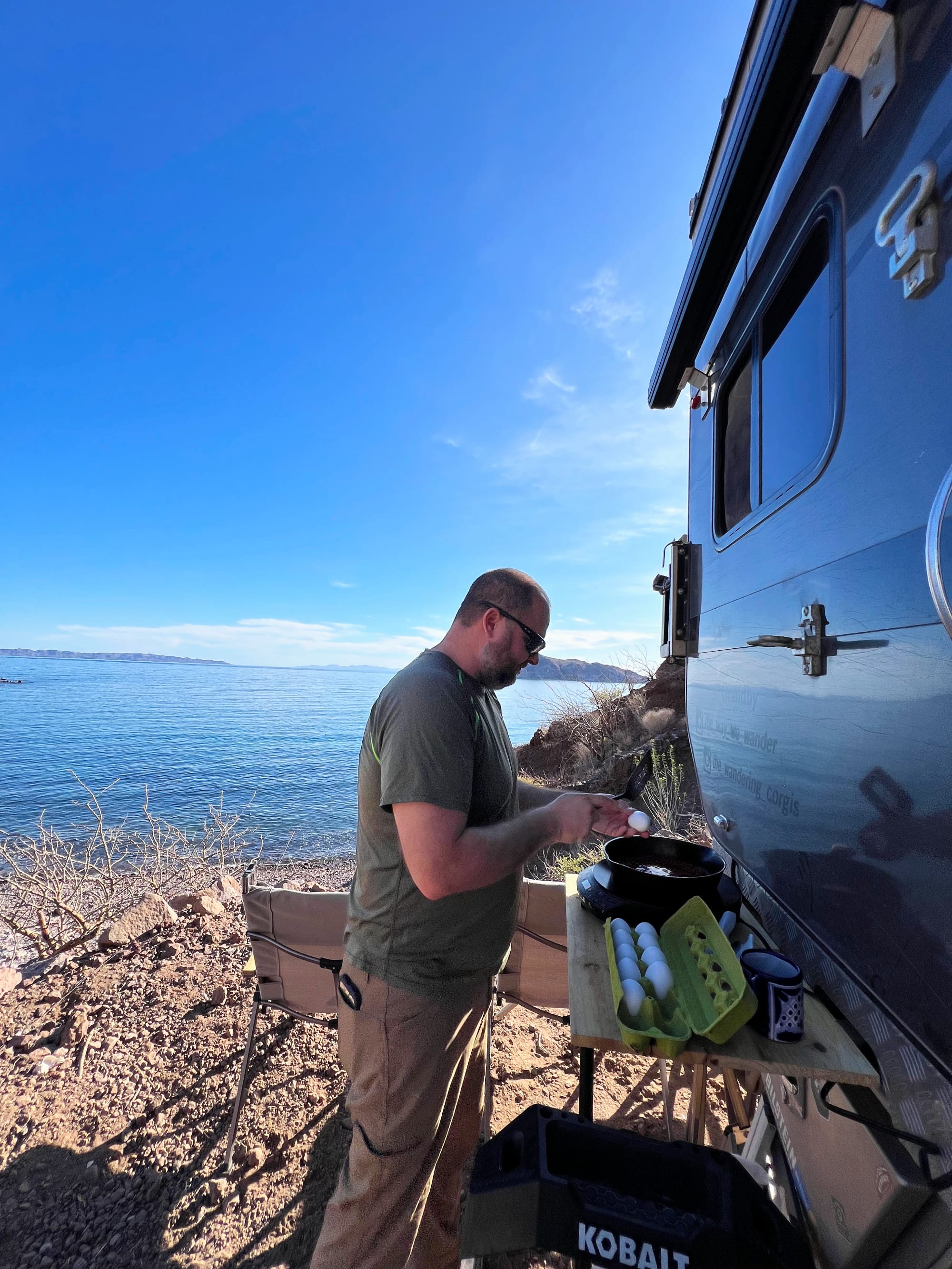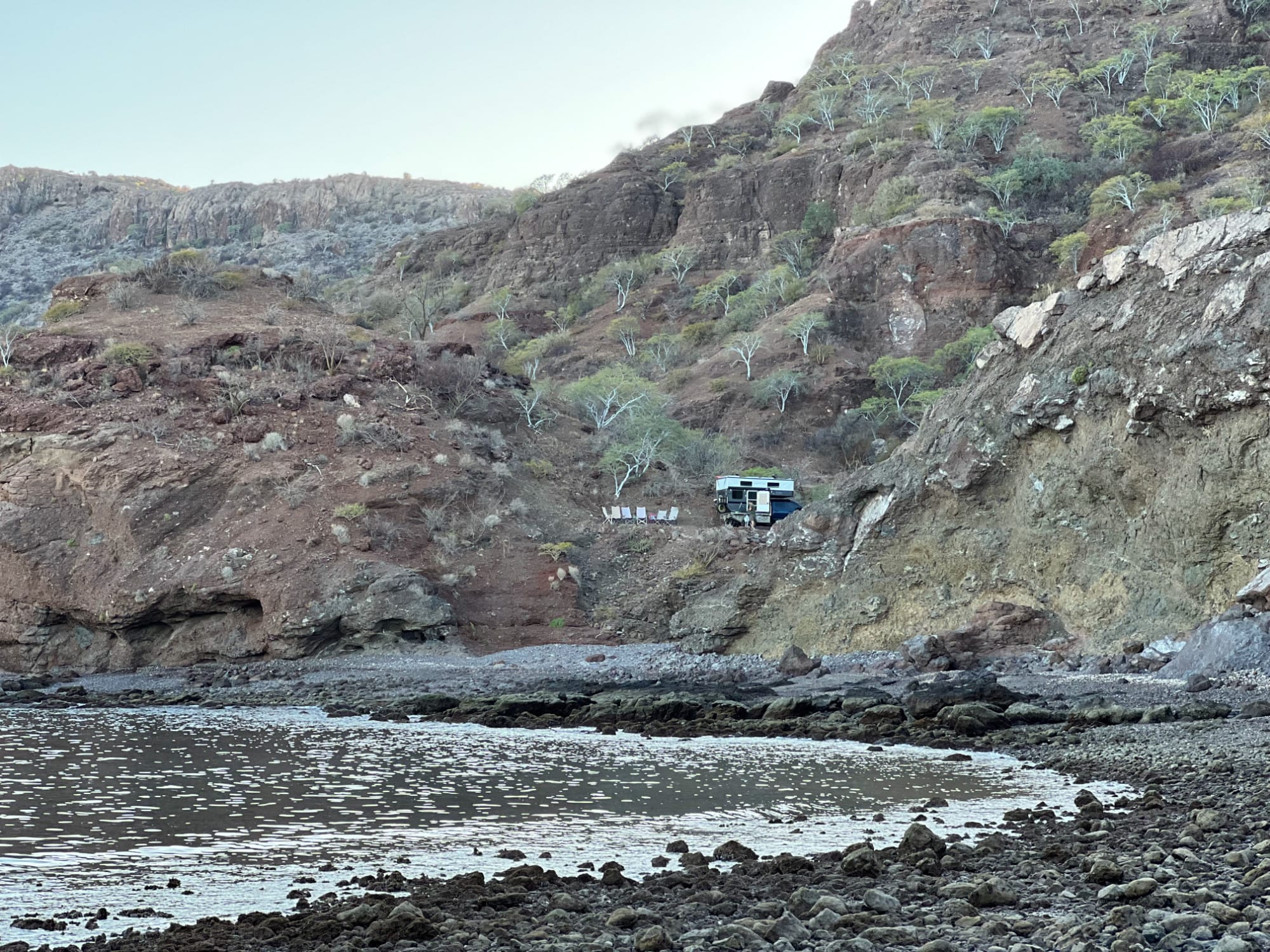 After our previous night spent in Loreto the tranquility of our new sea side camp is welcomed by all and everyone wakes ready for the days activities, whatever they may be. We spend the first part of the morning drinking our coffee while watching the water surface boil from predators of some sort chasing bait fish. All of the surface activity on the water spurs me to grab a pole and I try my luck fishing from the shore for a bit with no success before returning to the camper to make breakfast.