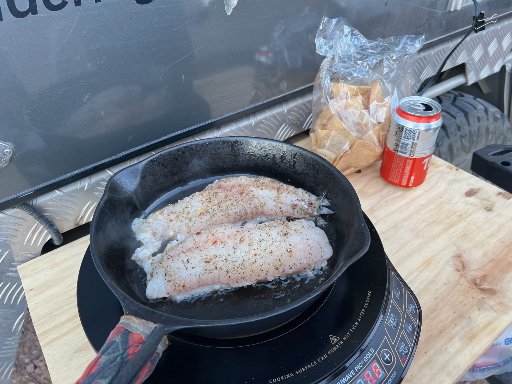 With the lack of success on conventional tackle I returned to the water after breakfast with my snorkel and a pole spear in hand. Unfortunately the tide was still a bit high and visibility was minimal. I swam around the rocks for an hour or so before leaving the water empty handed and decided to try later in the afternoon at low tide. Josh however was a bit more successful and managed to stick a small Cabria which he promptly fried for lunch!