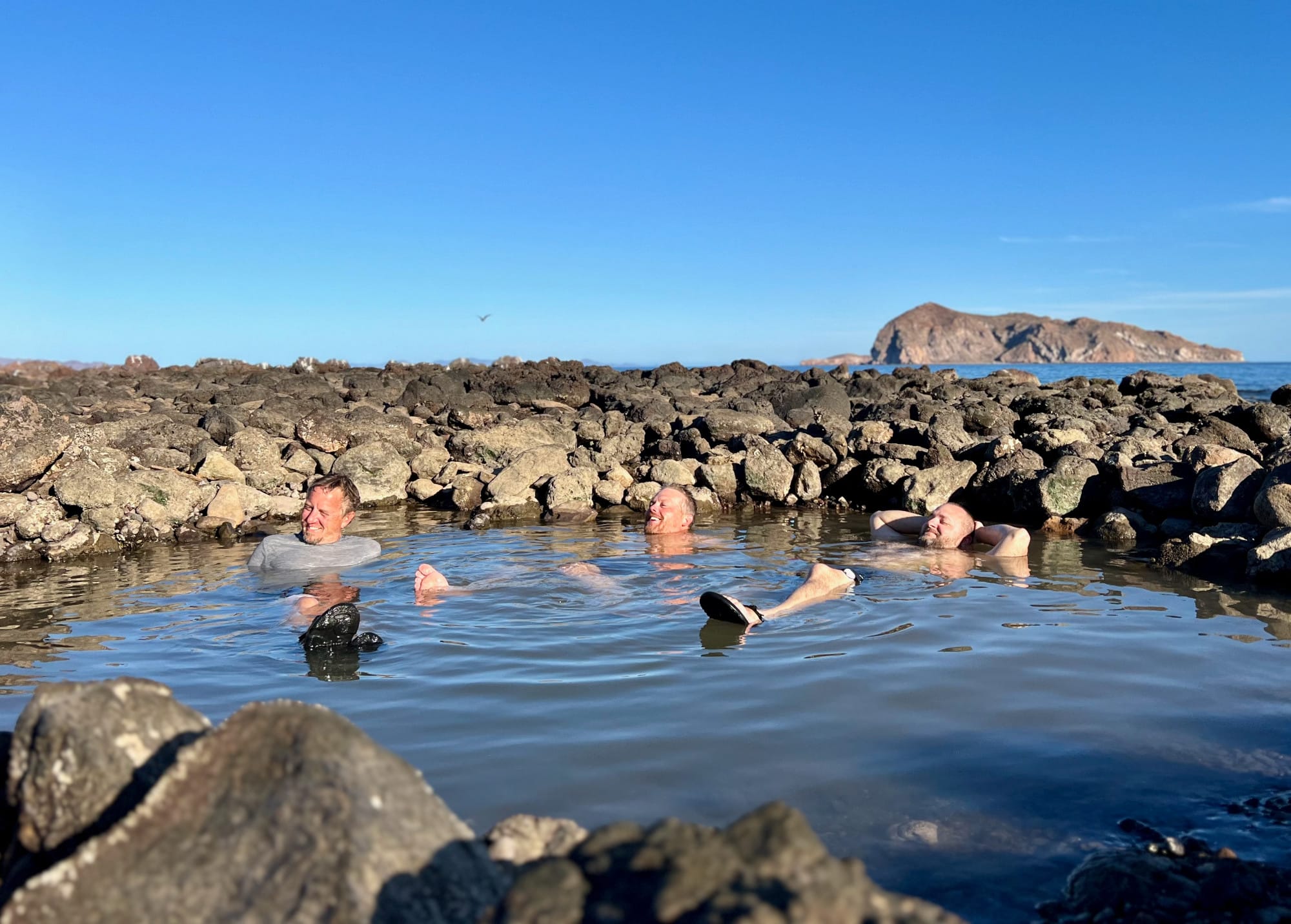 As the tide receded, slowly revealing the narrow spit of rocks leading to the hot springs, I returned to the water once again in hopes of spearing something for dinner. Being very near low tide, visibility was much better and I was able to see a lot more sea life than before although I still wasn’t spotting any fish worth taking. After nearly another hour in the water and still no success I bump into Josh and Mark and it seems Josh at least has been able to spear a large Mexican Hogfish. We swim around together for a bit and Josh points out another Hogfish that is hiding in the rocks about five feet below the surface. I dive down and barely spotting the fish my self release my spear into the opening. It is immediately apparent that I’ve stuck the fish and I resurface for air. At this point Josh, who is a much stronger swimmer and diver than either Mark or I, helps in retrieving the fish from within the rocks, which he is successful in. Unfortunately as soon as the fish is freed from the rocks it manages to escape the tip of the spear and after some searching we lose it for good. With the sun now set behind the mountains and the air temp rapidly dropping, a good soak in the hot springs before walking back up the hill to camp is hard to resist. The three of us ease into the spring, the water seeming much hotter than it truly is after being in the sea for the last hour or so.