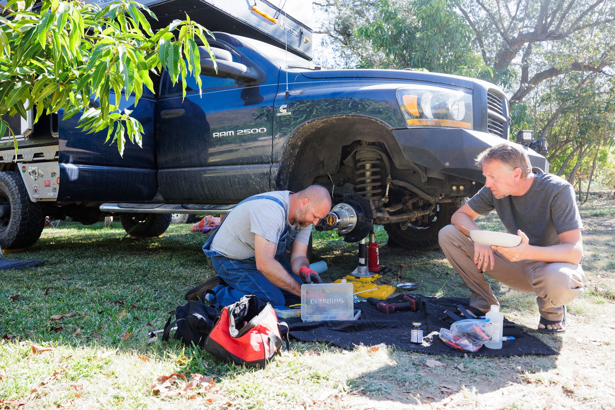 One perk that Rancho San Dionisio shares with Paraisio Misional in San Ignacio is grass! And much like our stay there, this one is as much about truck maintenance as it is about respite. Eight days ago while on the dirt road to the hot springs near San Cosme we had a BRAKE and ABS dash light come on. A quick inspection at the time revealed an almost severed wheel speed sensor wire at the passenger side hub assembly. Since then we have tried to get a replacement sensor at nearly every opportunity with no luck, the parts stores can get it but all of them say it is 3-4 weeks out, time we simply do not have seeing as we are boarding a ferry bound for mainland in less than 2 weeks. After my morning coffee I put on my bibs and get to work pulling the passenger side tire and brake rigging off so that I can access the sensor in hopes of repairing the wires. Thankfully Mark carries as many tools and spare bits and pieces as I do and he provides some compact uninsulated butt connectors and marine grade heat shrink that gets the job done.