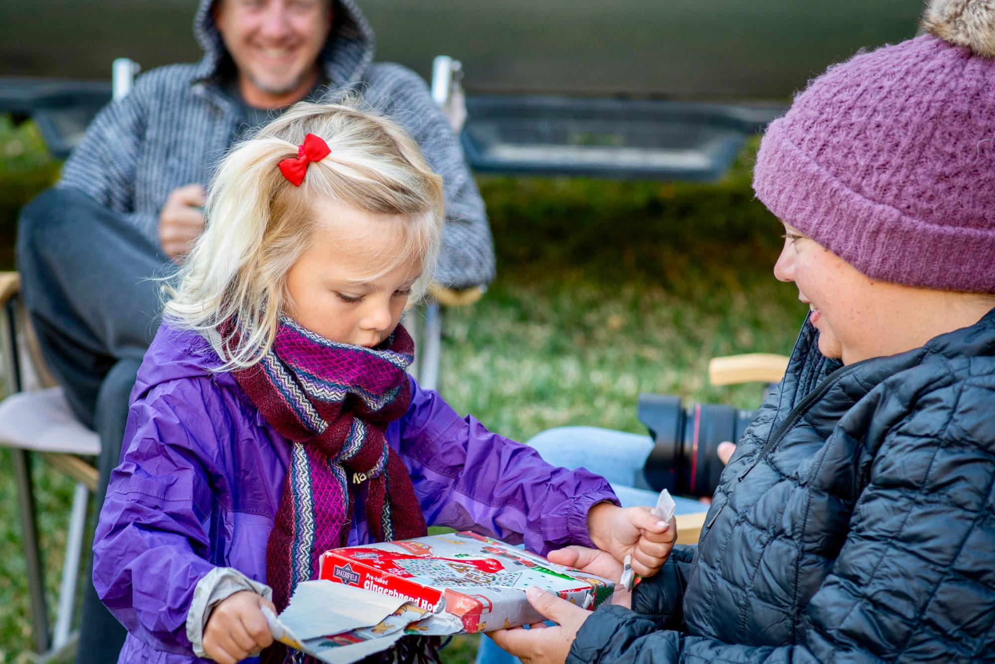Yesterday afternoon Darci asked me if I could once again take on the roll of Santa this year, not so much in the jolly fat guy with a beard sense but more the wake up early and place the presents under the tree before 4 year old Hannah bursts out of her camper in excitement sense. It is a part that I am happy and honored to play and at 6am I quietly slip out of our camper and do just that! Over our morning coffee and tea we all sit bundled up together for our humble gift exchange while little Hannah passes out the presents.