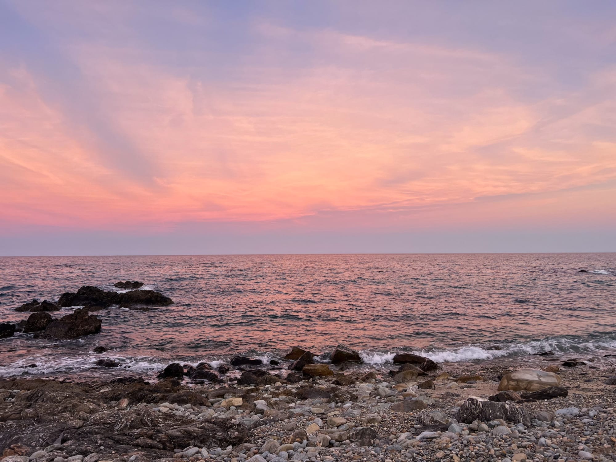 After climbing a couple of steep hills we round a corner to find ourselves looking down on a rocky beach where Josh and Darci have already set up camp on a spot that our friends have dubbed “Heart Beach”, a name given for the heart shape formed by the jagged hillside separating our camp from the sandy beach just south of us. Once the camper is set up we each string our twinkle lights and the vibe is officially set!
