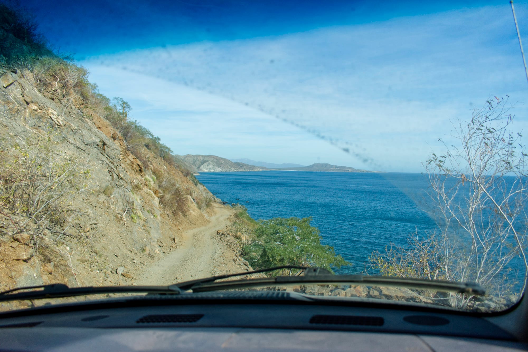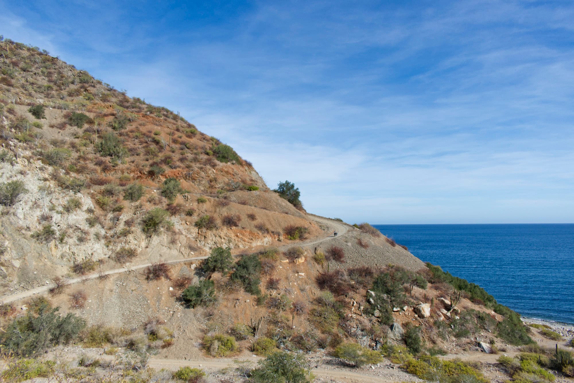 In the morning Josh and Darci are the first to get packed up and they depart camp about an hour ahead of us. We don’t have a great amount of distance to cover today however the steep narrow shelf road on which we are camped takes some time to traverse as we wind to and from, up and over, and in and out of the valleys that follow along the coastline to the north. Eventually we turn from the sea and head inland. After an hour and a half or so we reach the end of the dirt track and after airing our tires back up we continue on pavement towards La Paz.