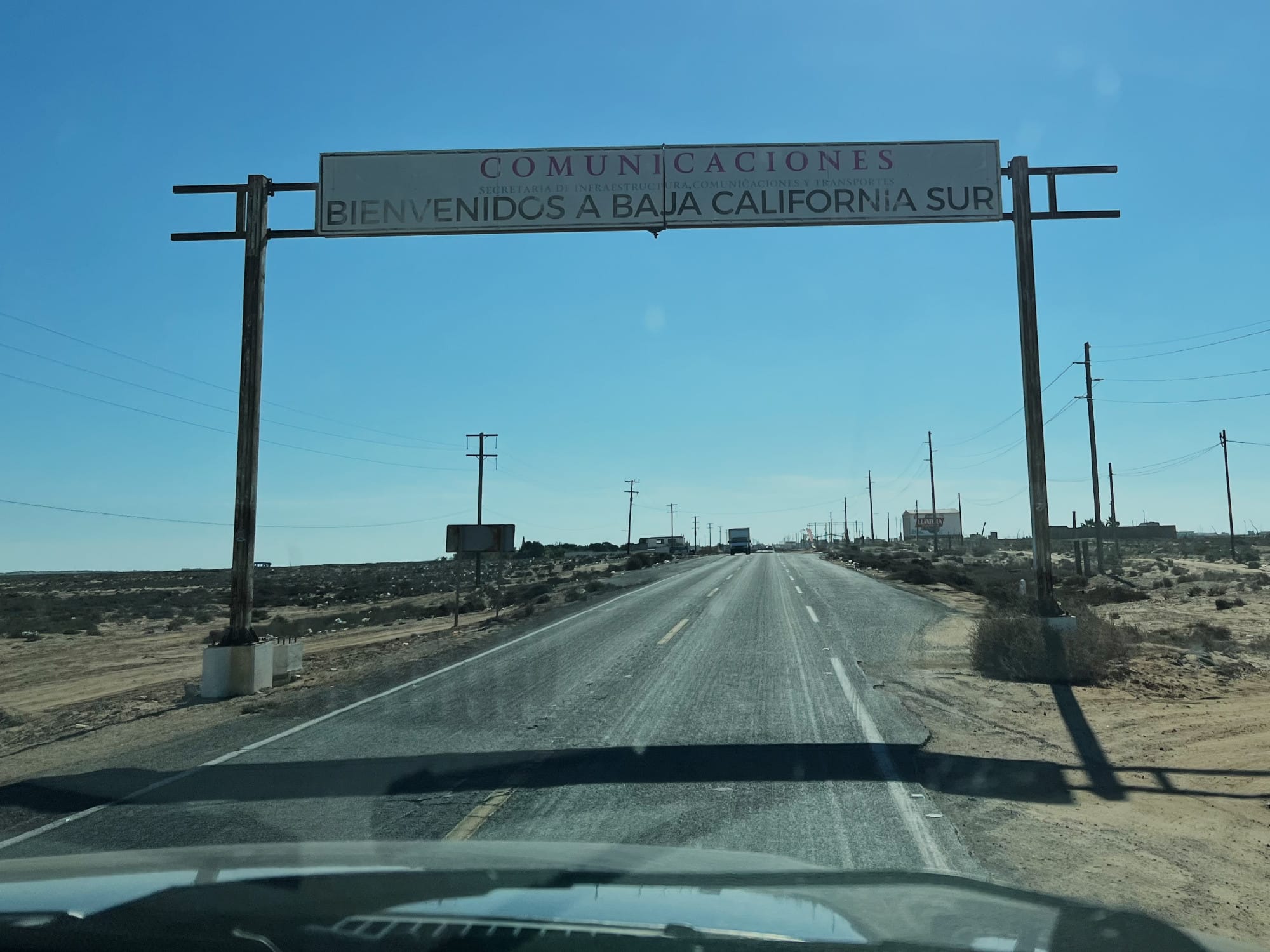 Today is a much anticipated day! We were up early again this morning and after coffee and breakfast began taking down camp with excitement while also not looking forward to the drive out to the highway. After 30 minutes of slowly crawling through the desert we finally reach the rickety barbed wire gate separating us from the main highway. Once back on pavement we have about a 2 hour drive on highway 1 (quite a lot of which is very much in disrepair) to reach our mid-day destination of Guerro Negro. As we approach Guerro Negro we go through an agricultural checkpoint situated on the state line of Baja California and Baja California Sur. At the checkpoint a gentleman informs us that it is 20 pesos (1 usd) to pay for the treatment sprayed on the undercarriage of our truck. Oddly enough neither the car in front of us nor the car behind us were required to pay this “fee”. I don’t think we were required to pay said fee either!